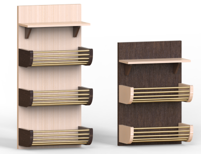 Ścianka z półką oraz zestawem kontenerków. Kontenerki posiadają półkę oraz ograniczniki w postaci mosiężnych rurek - przykład wykonania. Możliwość wykonania wizualizacji z użyciem zewnętrznych dekorów. |